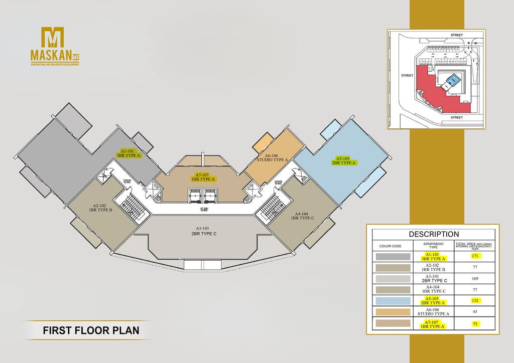 The first floor offers 7 exclusive apartments, including studios, 1-bedroom, 2-bedroom, and 3-bedroom units.